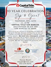 Join us at our office to celebrate 10 years of being in the community. We will be collecting toys as well for the women's shelter this day as well. We need new, unwrapped and unused toys! There will be a ribbon cutting ceremony followed by drinks and snacks. Also free pictures with Santa.